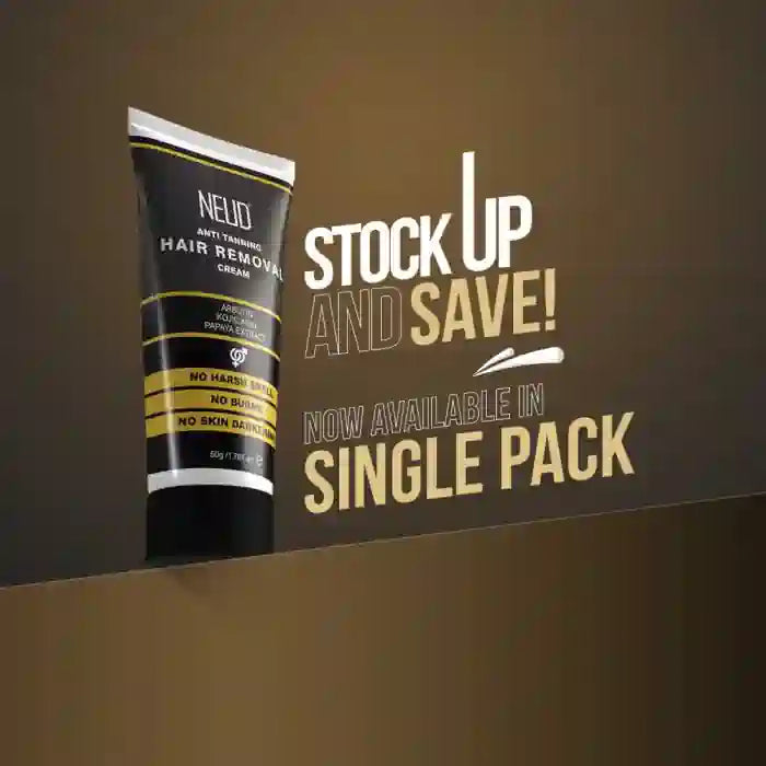 NEUD Anti-Tanning Hair Removal Cream is ideal for removing unwanted body hair from arms, legs, chest and back in just 5 minutes. It is enriched with arbutin, kojic acid, papaya extract and aloe vera. The premium formula of this HRC is tough on hair yet gentle on the skin. Now, get smooth hair-free skin with no harsh smell, skin darkening or burning sensation. That too with anti-tanning effect with each use!