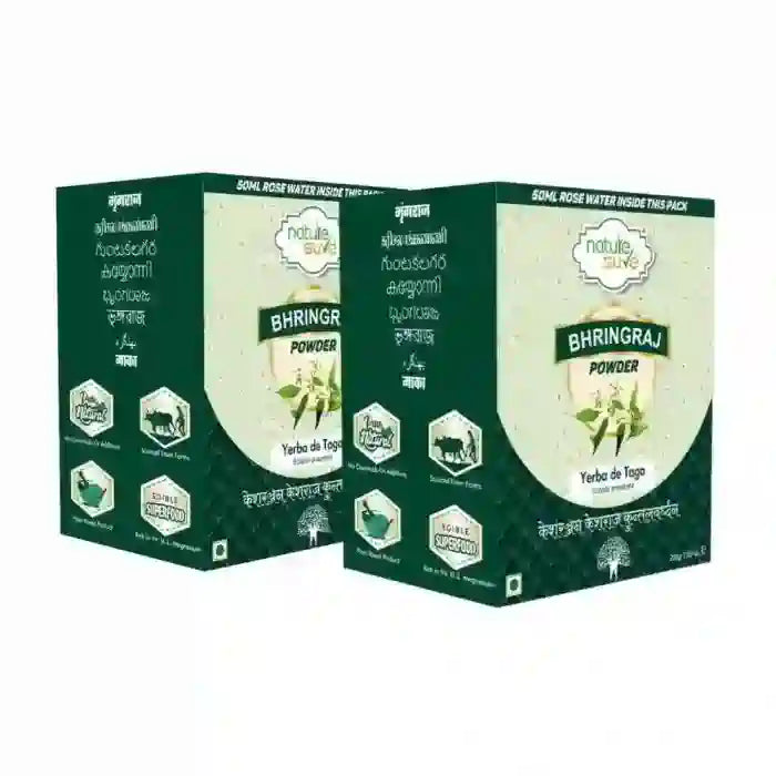 When you buy this pack of Nature Sure Bhringraj Powder 200 grams, you also get 50ml rose water, one measuring spoon, one brush and a how-to-use recipe leaflet inside the pack.