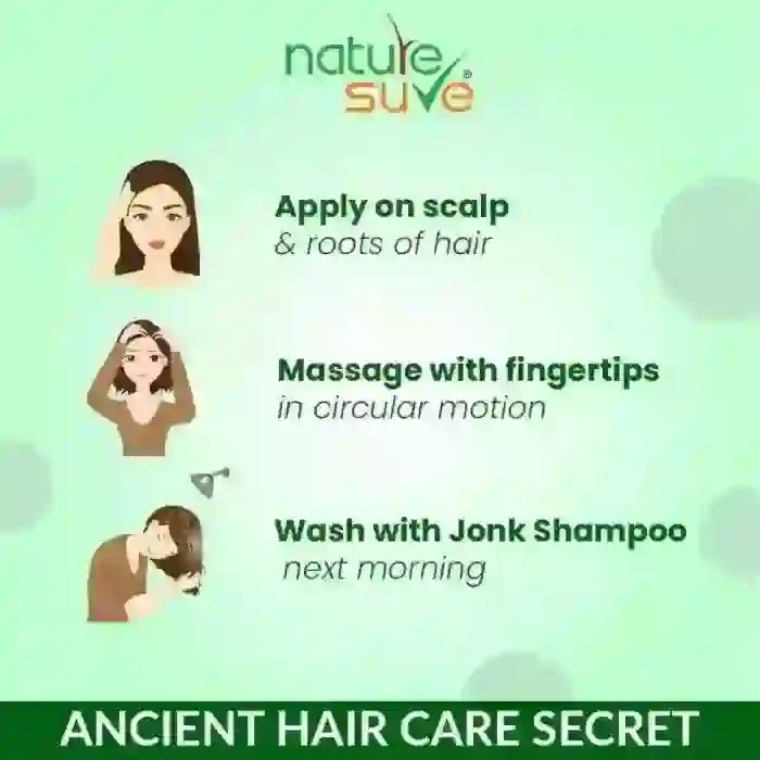 Regular massage with jonk tail at night is considered highly beneficial. For best results, also use Nature Sure Jonk Shampoo to wash off hair the next morning. Avoid using chemical-based soaps and shampoos on hair.