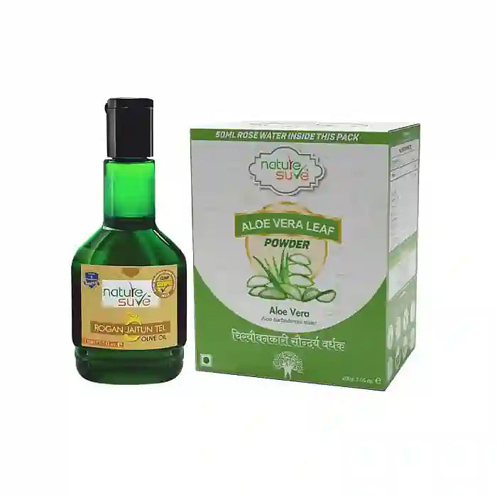 When you buy this super-value combo, you get one pack of 110ml Nature Sure Rogan Jaitun Olive Oil and one pack of 200g Nature Sure Aloe Vera Leaf Powder sourced directly from farms with 50ml Rose Water free. These top certified quality products do not contain any chemicals, preservatives, additives or colors. They have been processed and packed at an ISO and GMP certified unit.