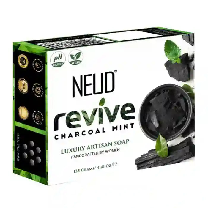 Experience the ultimate in skincare luxury with NEUD Revive Charcoal Mint Artisan Soap. Handcrafted by women, each 125g bar combines the natural detoxifying power of charcoal with the refreshing benefits of mint. Infused with 0.10% Tea Tree Leaf Oil, 0.10% Peppermint, 0.10% Eucalyptus Leaf Oil, and 0.15% Khus Seed (Vetiver), this soap offers a revitalizing cleanse that purifies and rejuvenates your skin.