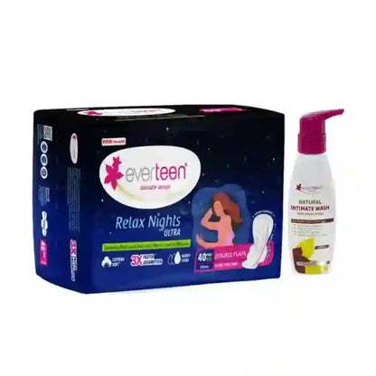 When you buy this super-value combo, you get one pack of everteen Relax Nights Ultra Soft 40 XXL Overnight Sanitary Pads enriched with Neem and Safflower, and one pack of everteen Witch Hazel Intimate Wash 105ml for moms.