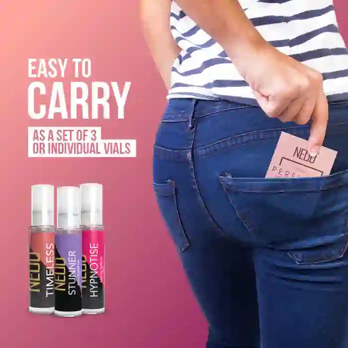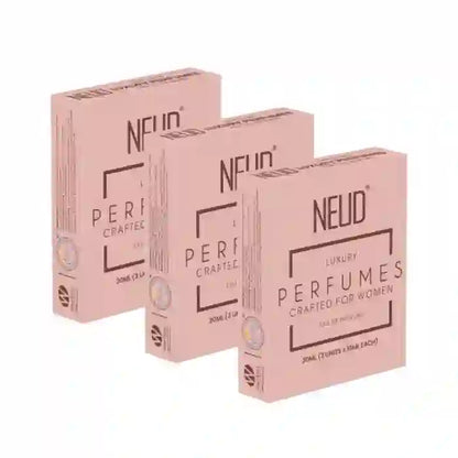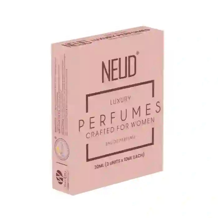 Each pack contains three 10ml vials of NEUD Premium Perfumes for Women.