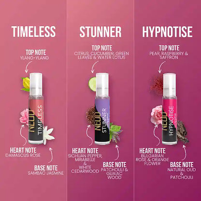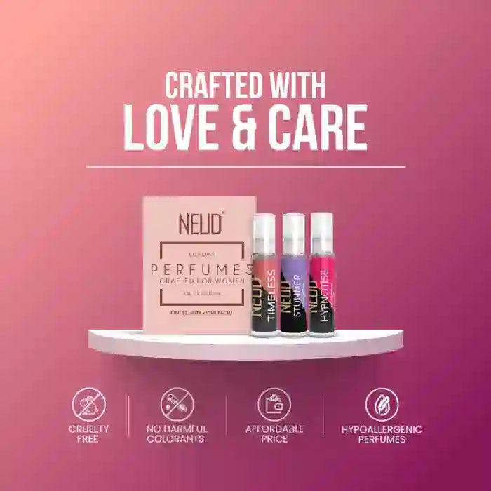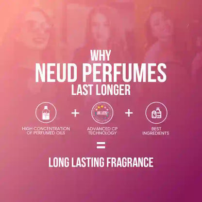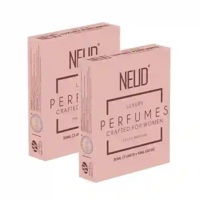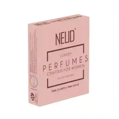 NEUD offers three exciting luxury perfumes for women made with advanced CP technology for a super long-lasting performance, brilliance and clarity. Each combo set contains three 10ml vials of opulent and lavish Eau De Parfums. With up to 85 full spritzes in each vial, you get approximately 255 total spritzes of fragrance in every set. The three feminine perfume vials in this set include: