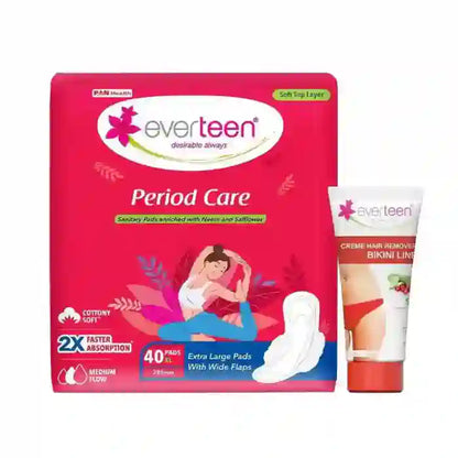 When you buy this super-value everteen combo, you get one pack of everteen Period Care XL Soft 40 Sanitary Pads enriched with Neem and Safflower, and one pack of everteen Silky Bikini Line Hair Cream 50g.