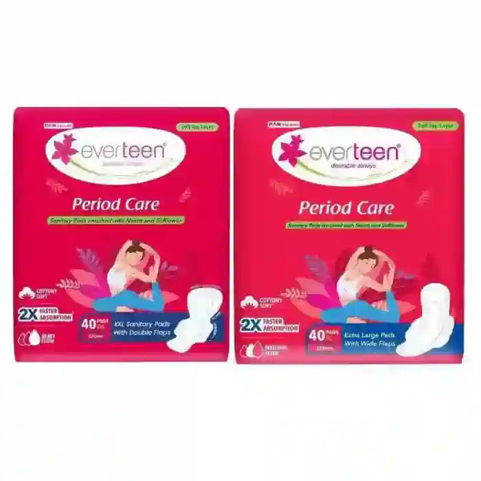 When you buy this super-value combo, you get one pack of 40 everteen Period Care XXL Soft Sanitary Pads and one pack of 40 everteen Soft XL Sanitary Pads, both enriched with neem and safflower.