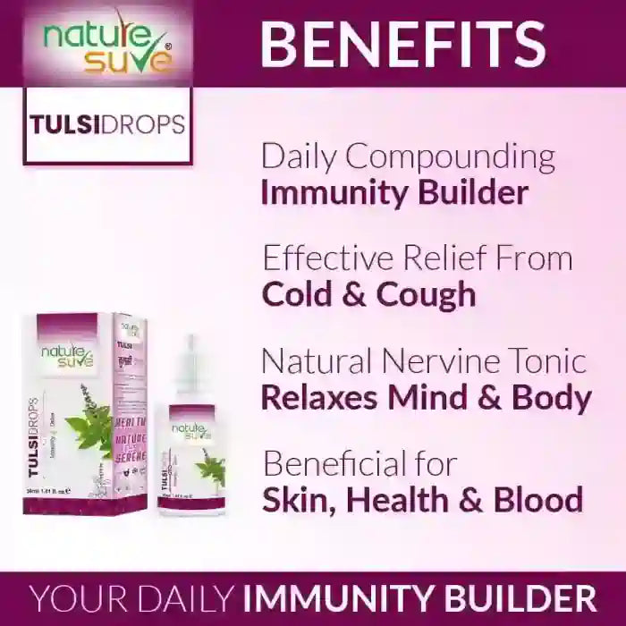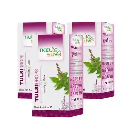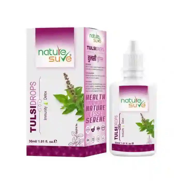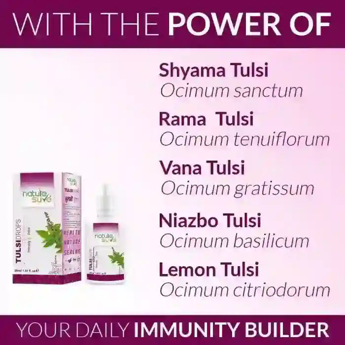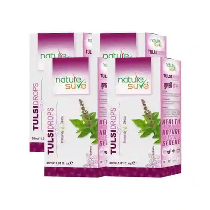 Nature Sure Tulsi Drops are a natural way to build immunity over time with daily regular usage. It contains powerful extracts of five different types of tulasi, namely rama tulsi, shyama tulsi (krishna tulsi or kala tulsi), vana tulsi, niazbo tulsi (also known as sweet basil) and lemon tulsi (also known as nimbu tulsi). This combination is popularly called panch tulsi ark, which enhances the benefits of each type.