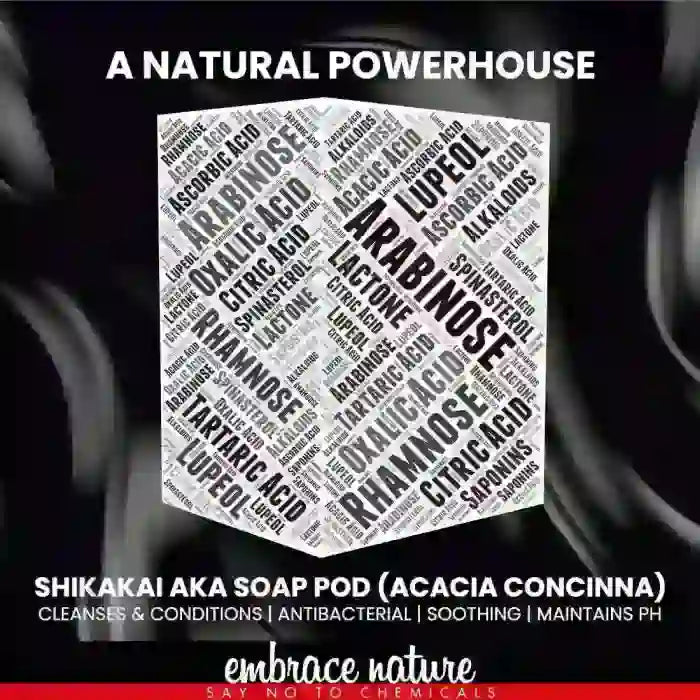 Shikakai, also known as ‘hair-fruit’, Soap Pod, Shika, Satala, Seekaaya, Bahu Phena, Phenila, Virala, Sari, Tatphala, Charmasahva, Chikaka and Dipta, is a skin and scalp friendly ayurvedic herb that has been used to promote hair and skin health for generations. A natural antimicrobial and anti-inflammatory, it helps build collagen and strengthen hair roots. Shikakai may also help make hair silky and lustrous, fight dandruff and greying, and arrest hair lice and dry scalp. It also exerts laxative and suppository properties. Shikakai has a natural ability to cleanse and act as a surfactant, and is rich in flavonoids, monoterpenoids, alkaloids, glycosides, amino acids, tannins and phenolic compounds.
