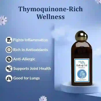 Nature Sure Kalonji Tel contains Thymoquinone (TQ), a natural therapeutic phytochemical which has been widely studied in scientific researches for its benefits in bone and joint care, allergy, antioxidant and anti-inflammatory.