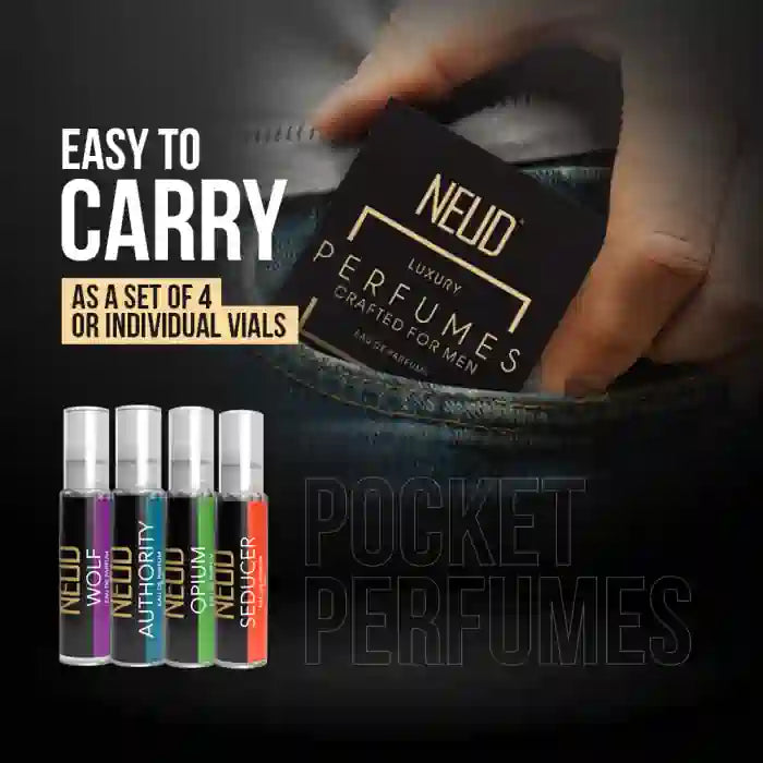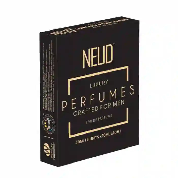 NEUD brings four exciting luxury perfumes for men made with advanced CP technology for a super long-lasting performance, brilliance and clarity. Each pocket perfume combo set contains four 10ml vials of opulent and lavish Eau De Parfums. With up to 85 full spritzes in each vial, you get approximately 340 total spritzes of fragrance in every set.