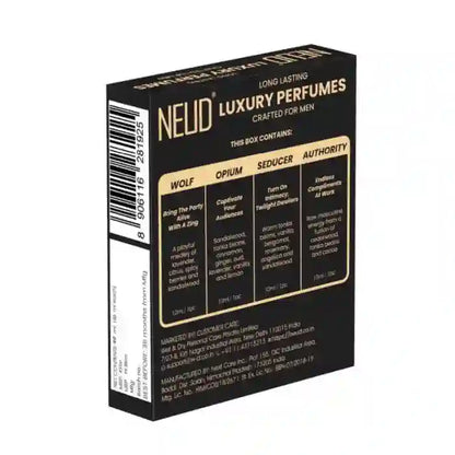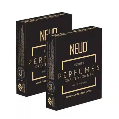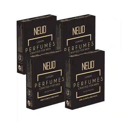 Each pack contains four 10ml vials of NEUD Premium Perfumes for Men.