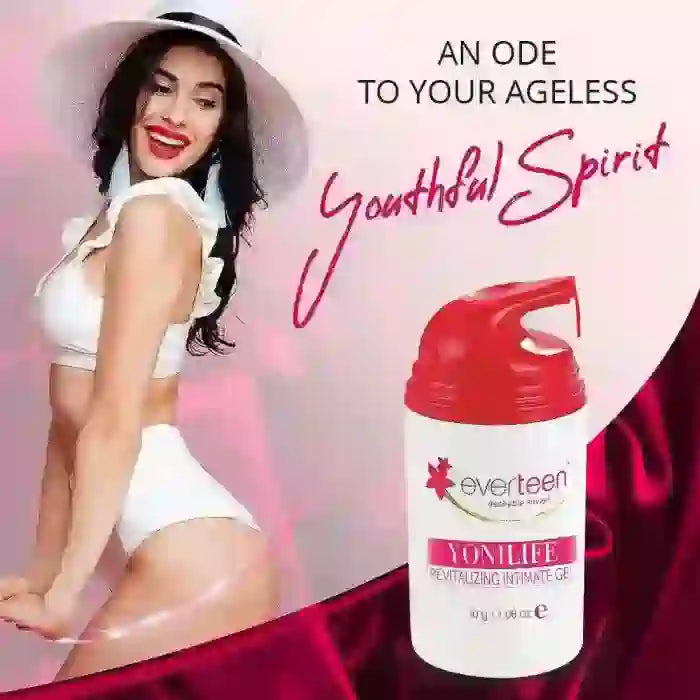 With age (and often after childbirth), a woman’s private parts undergo natural changes such as reduction in pelvic floor strength, thinning of vulvar skin, darker pigmentation, loss of skin elasticity, dryness of vulva, pain or discomfort during intercourse and dissatisfaction in physical intimacy. Weakened pelvic muscles can even lead to health issues like urinary incontinence. Such concerns get aggravated with the onset of perimenopause and menopause. Low estrogen levels result in lesser blood flow that, in turn, reduces collagen production in the vulvar tissue. Ageing can also disrupt natural vaginal pH balance. everteen Yonilife Gel is your natural health partner in protecting and nourishing your lady bits. With every use, your vajayjay becomes healthier and happier.