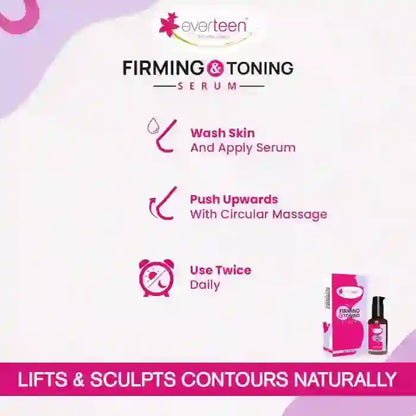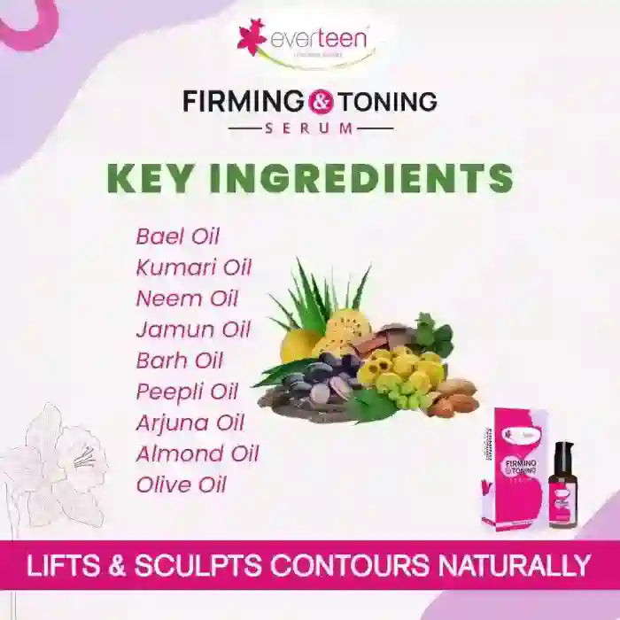 everteen, the complete feminine hygiene expert, brings to you a compact yet powerful solution. everteen Firming and Toning Serum helps shape and lift up contours in women. Made from natural and safe ingredients such as Bael, Kumari, Neem, Jamun, Barh, Peepli, Arjuna, Olive and Almond Oil, it is exceptionally effective and easy to use. The skin-friendly, lightweight and non-greasy formula of everteen firming and toning serum is non-comedogenic, that is, it does not clog skin pores. It is also free from harmful chemicals such as parabens, phthalates, sulphates or artificial colors.