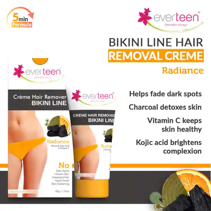 everteen RADIANCE Bikini Line Hair Remover Creme is enriched with pure and natural extracts of charcoal, kojic acid and vitamin C that helps fade dark spots and leaves a pleasant after-feel. Pure extracts of charcoal help detox the skin. Vitamin C is a potent antioxidant that keeps your intimate skin cells healthy. Kojic acid is a natural skin lightening agent. The “No Harsh Smell” formula of everteen® crème gives your sensitive skin gentle cleansing and removes hair effectively in just 5 minutes without any itching, irritation or burning, to provide you a soft and smoother bikini line.