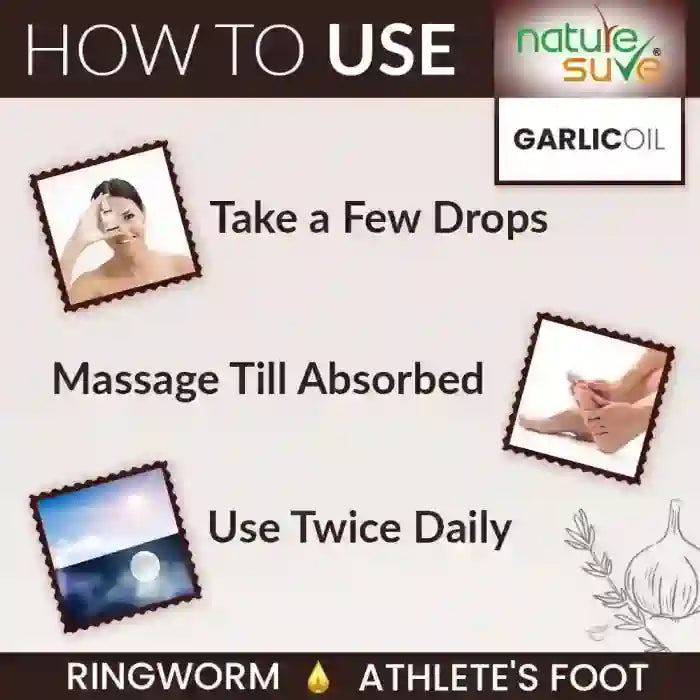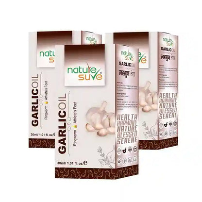 Nature Sure Garlic Oil is naturally very effective in managing ringworm and athlete's foot. Since ancient times, Garlic has been used for its excellent health and medicinal properties in Indian, Egyptian, Babylonian, Greek, Roman, and Chinese civilizations. It is considered as a natural anti-bacterial, anti-fungal and anti-parasitic. Lahsun oil also acts as an anti-inflammatory and can be beneficial in managing swollen joints, body aches, rheumatism, neuralgia, muscular pain, nerve pain and lower back pain. With repeated use, garlic oil may also help in managing psoriasis, dark circles, pimples, wrinkles and scars.