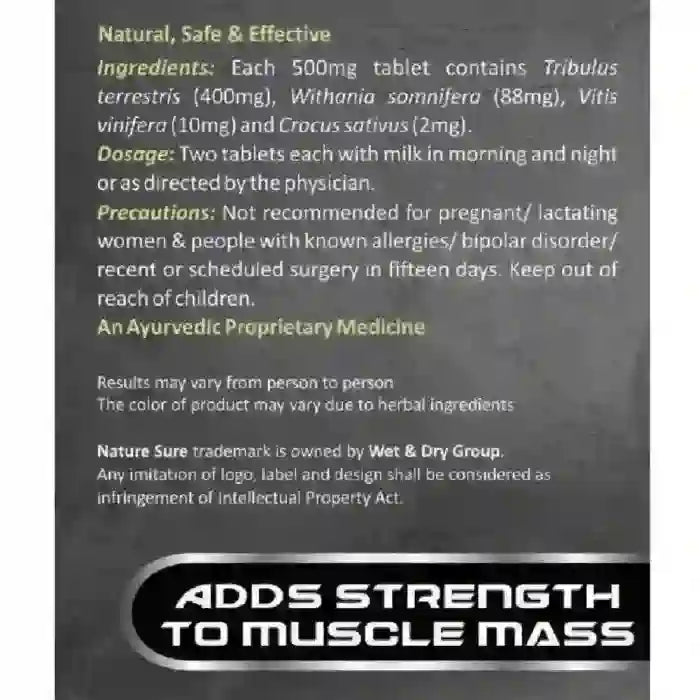 Each 500mg tablet contains Tribulus terrestris (400mg), Withania somnifera (88mg), Vitis vinifera (10mg) and Crocus sativus (2mg)