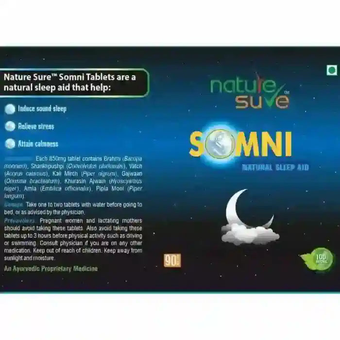 Made with pure and top-grade natural ingredients, Nature Sure SOMNI Natural Sleep Aid Tablets are an Ayurvedic formulation of carefully selected herbs that have traditionally known to help manage sleep disorders, fatigue, nervous debility and stress.