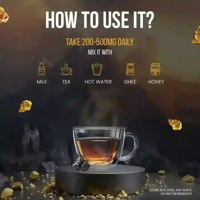 Take 200-500mg of ManSure Shilajit Gold Power resin on an empty stomach daily or as advised by a qualified Ayurvedic practitioner. Mix it in 100ml of milk, tea, hot water, ghee (clarified butter), or honey until fully dissolved. One-third of a green pea seed is roughly 200mg of shilajit.