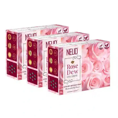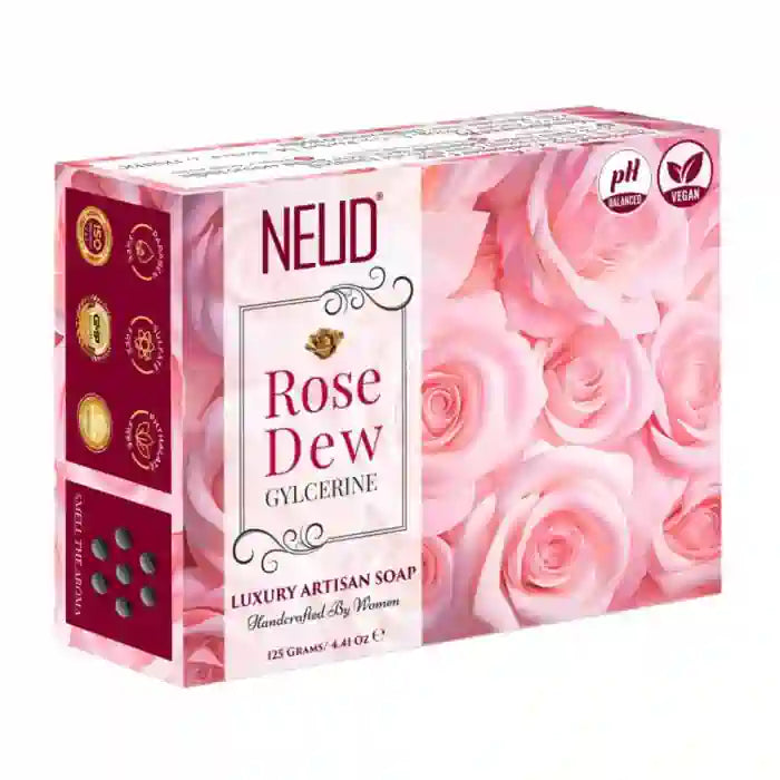 Certified by ISO and GMP standards and Halal, NEUD Rose Dew Glycerine Soap guarantees premium quality and ethical manufacturing practices. Indulge in deep moisturization, gentle exfoliation, and a radiant skin glow with this luxurious soap.