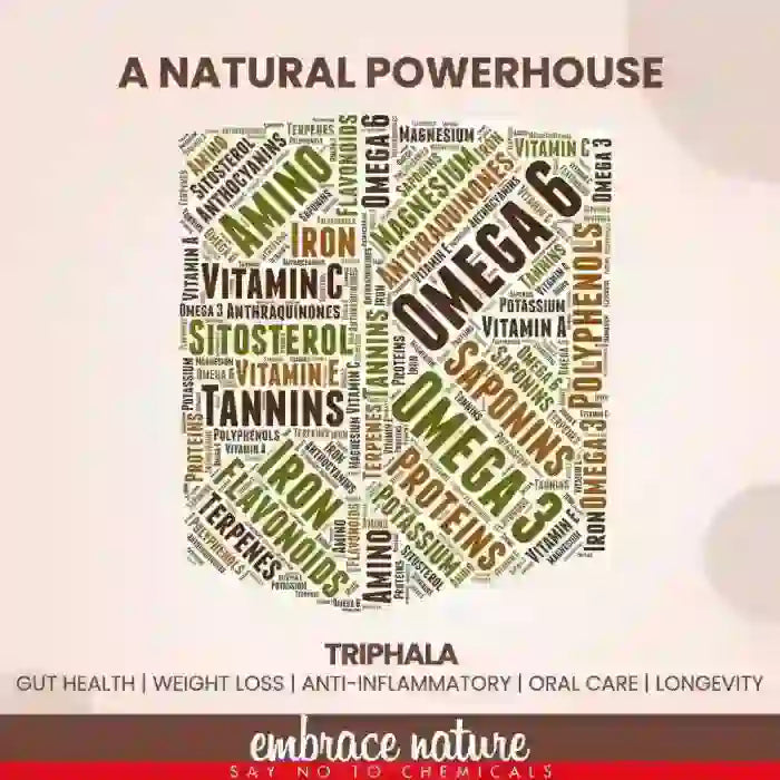 Triphala has potent benefits in heart, liver, digestive, eye, skin and oral health. It may support optimal glucose levels and managing obesity, besides easing symptoms of inflammatory conditions. It may also help stimulate production of collagen and elastin.
