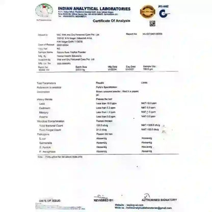 Nature Sure Triphala Powder is a pure plant-based product that is sourced directly from farms. This top certified quality product is non-GMO and does not contain any chemicals, preservatives, additives or colors. It has been processed and packed at an ISO and GMP certified unit. Its purity and authenticity have been certified by a GLP-approved laboratory.