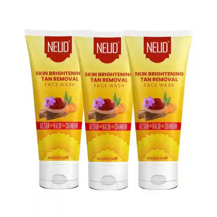 Illuminate your skin and fade away sun tans with daily use of NEUD Skin Brightening Tan Removal Face Wash. It is enriched with kesar (saffron), haldi (turmeric) and chandan (sandalwood). Kesar helps lighten skin complexion and remove tanning, acne scars and dark spots. Anti-inflammatory and antioxidant properties of haldi brighten the skin. Chandan heals and helps improve skin elasticity and reduce pigmentation.